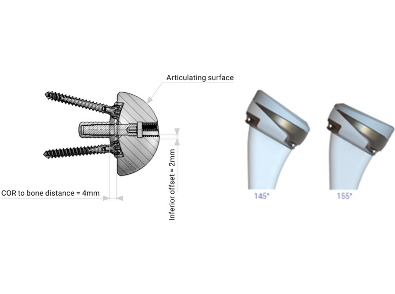 With an innovative design of the liner, the surgeon has the opportunity to adapt the system to the patient's conditions by potentially increasing joint ROM (145° humeral inclination) and maximizing joint stability (155° humeral inclination). The glenosphere has a lateral offset (4 mm) and also an inferior offset (2 mm) to reduce the risk of scapular notching. The complete hemispherical design delivers stability through full ROM.